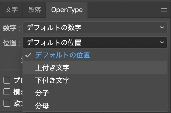 文字を小さくして、上や下に配置する機能です。例えば「cm²」や化学式(H₂O)などを正しく表示する際に使われます。フォントがOpenType機能に対応している場合は、OpenTypeパネル内で選択することができます。