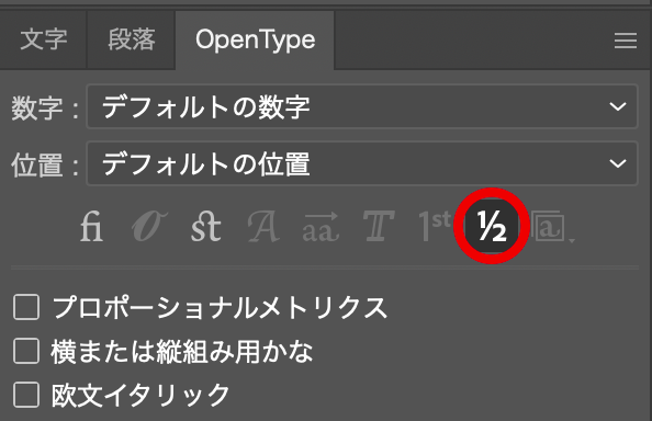 機能によっては、適用できる文字が決まっている場合もあり、「オールドスタイル数字は数字を選択したときのみ」など、対象の文字を選択していないと、機能が有効にならないことがあります。