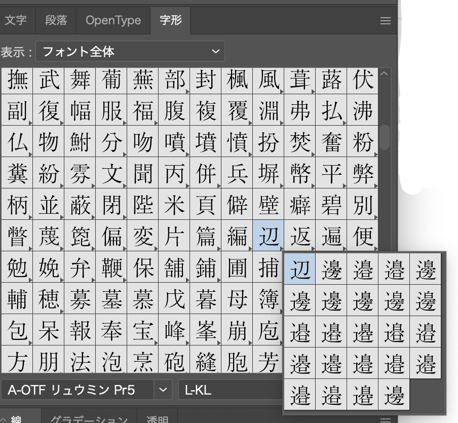 Illustratorでは、文字を選択した状態で異体字オプションを開くと、利用可能なバリエーションを確認できます。